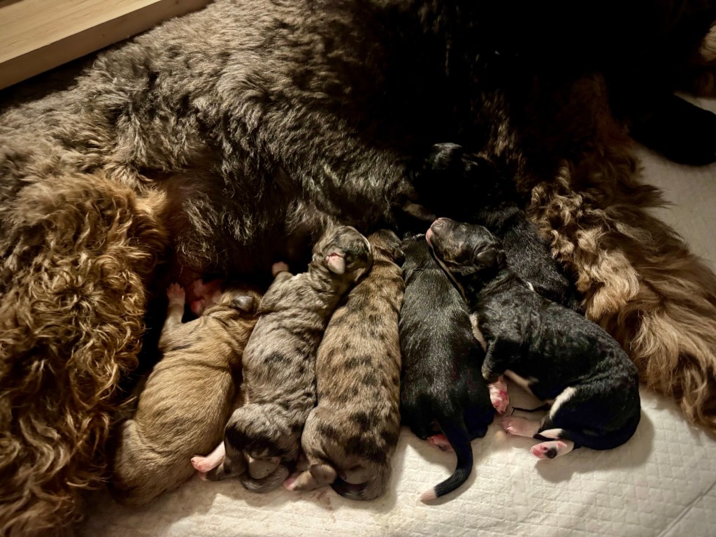 I’ll share the final puppy count, colors, and lots more photos tomorrow once everyone gets a little rest. For now, we’re just soaking in the quiet puppy snuggles and listening to all the tiny grunts & squeaks. 💛