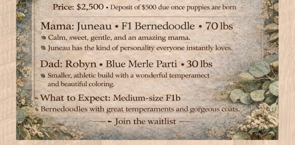 Available Bernedoodles ✨ Bernedoodle WAITLIST! WAITLIST 1- Steph 2- Usha 3- Ross 4- Beth 5- Tara 6- 7- 8- 9- 10-