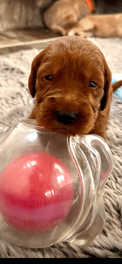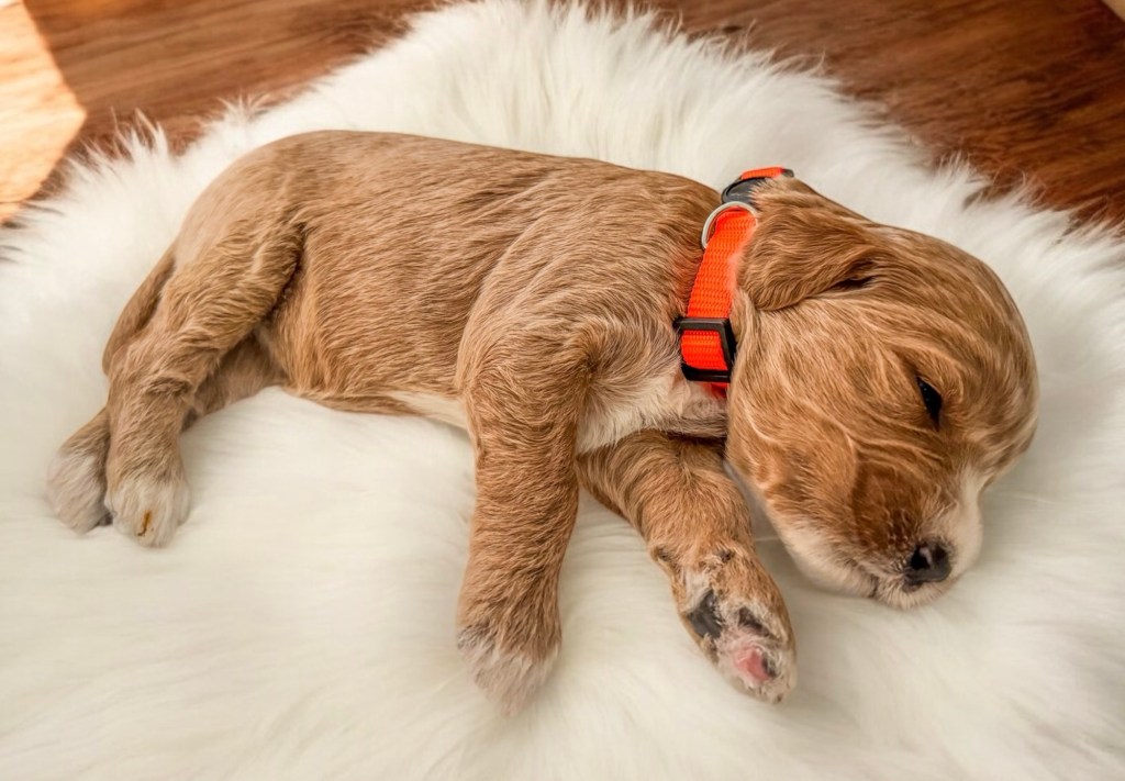 This sleepy little boy is the BIGGEST of the litter.. his eyes are open and he’s learning to walk!